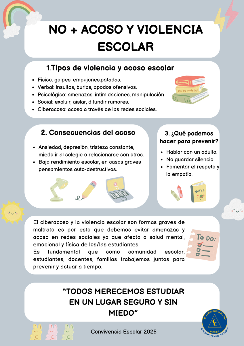 El afiche busca sensibilizar sobre la importancia de reconocer y prevenir cualquier tipo de comportamiento agresivo o discriminatorio que pueda afectar el bienestar de nuestros y nuestras estudiantes. Esta actividad forma parte de nuestro compromiso institucional con la formación integral de los y las estudiantes, fomentando el diálogo, el respeto y la empatía en la vida escolar diaria.
